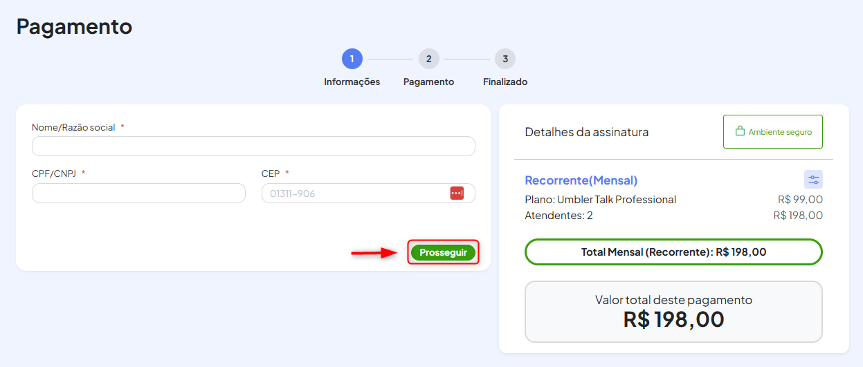 Em seguida, insira os dados para pagamento, como nome, CPF, CNPJ e outros.