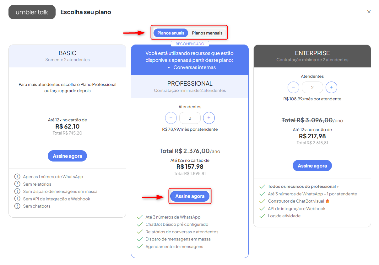 Se você escolher a opção de pagamento anual, aproveita um desconto exclusivo! Para seguir com essa opção, é só selecionar o plano anual e garantir essa vantagem! -