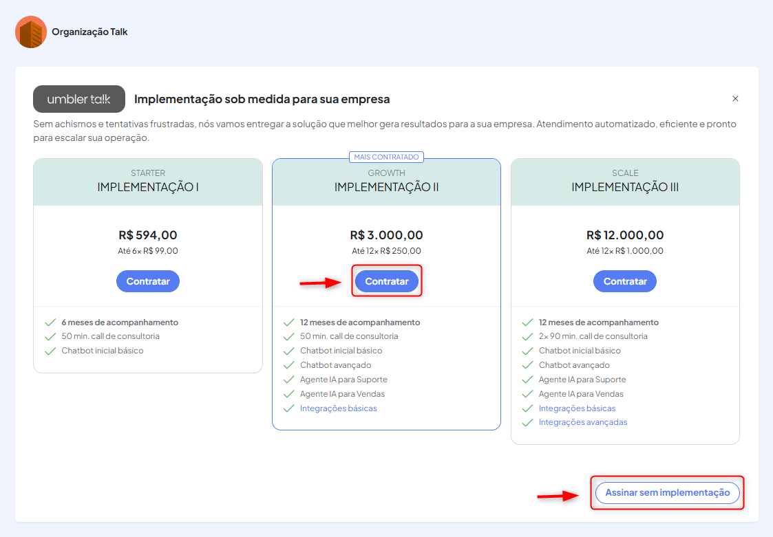 Na próxima página, você poderá ser convidado(a) a assinar um plano de implementação, caso tenha interesse. Nossos planos de implementação oferecem acompanhamento especializado para configurar o Talk conforme as necessidades do seu negócio, com consultoria, suporte avançado e integrações personalizadas. Se desejar, selecione o plano que melhor atende ao seu caso clicando em Contratar. Caso prefira seguir apenas com a assinatura da plataforma, clique em Assinar sem implementação para prosseguir.