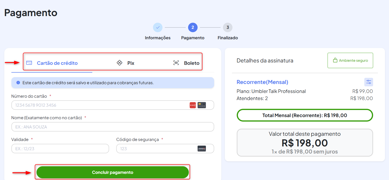 Escolha como deseja realizar o pagamento, como cartão, Pix ou boleto, e clique para prosseguir.