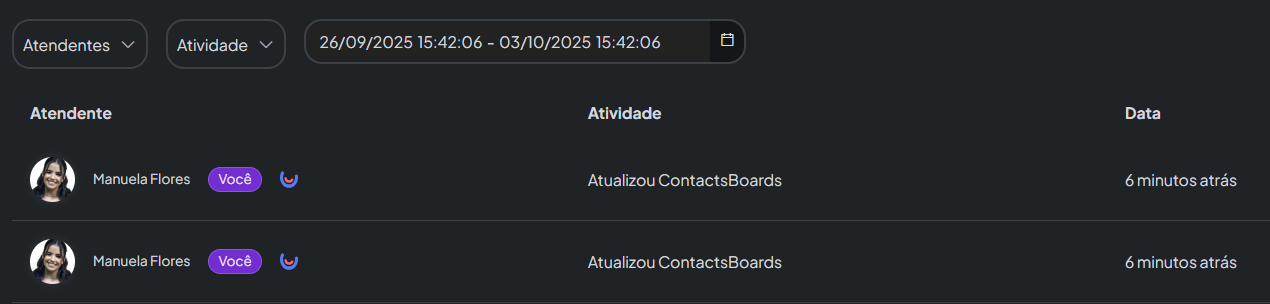 Logo uma página de acompanhamento será aberta. Sendo assim, basta escolher o período desejado para visualização selecionando uma data de início e uma data final e clicar em pesquisar. Além disso, você pode filtrar por atividade realizada e por qual atendente foi feito.