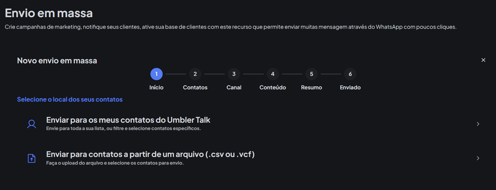Como podemos ver na imagem abaixo, temos duas opções de envio em massa: envio a partir de contatos da agenda e envios a partir de um arquivo.