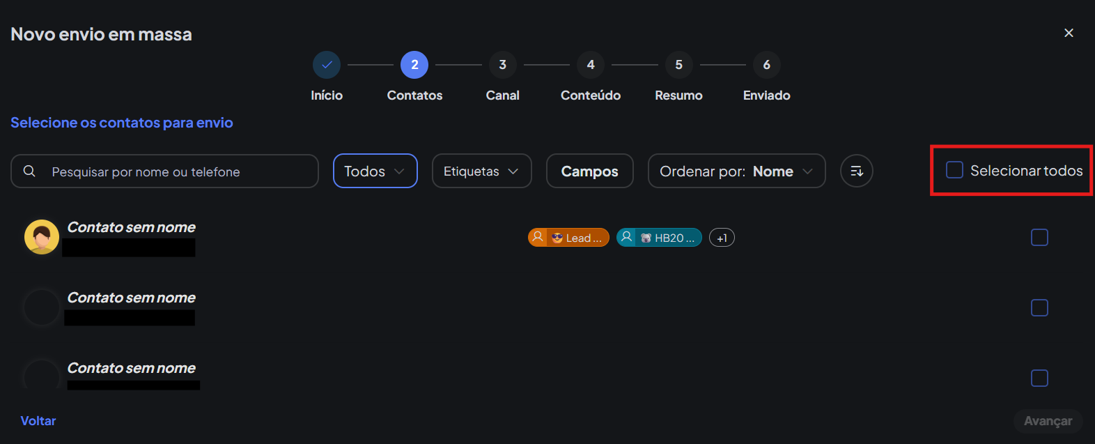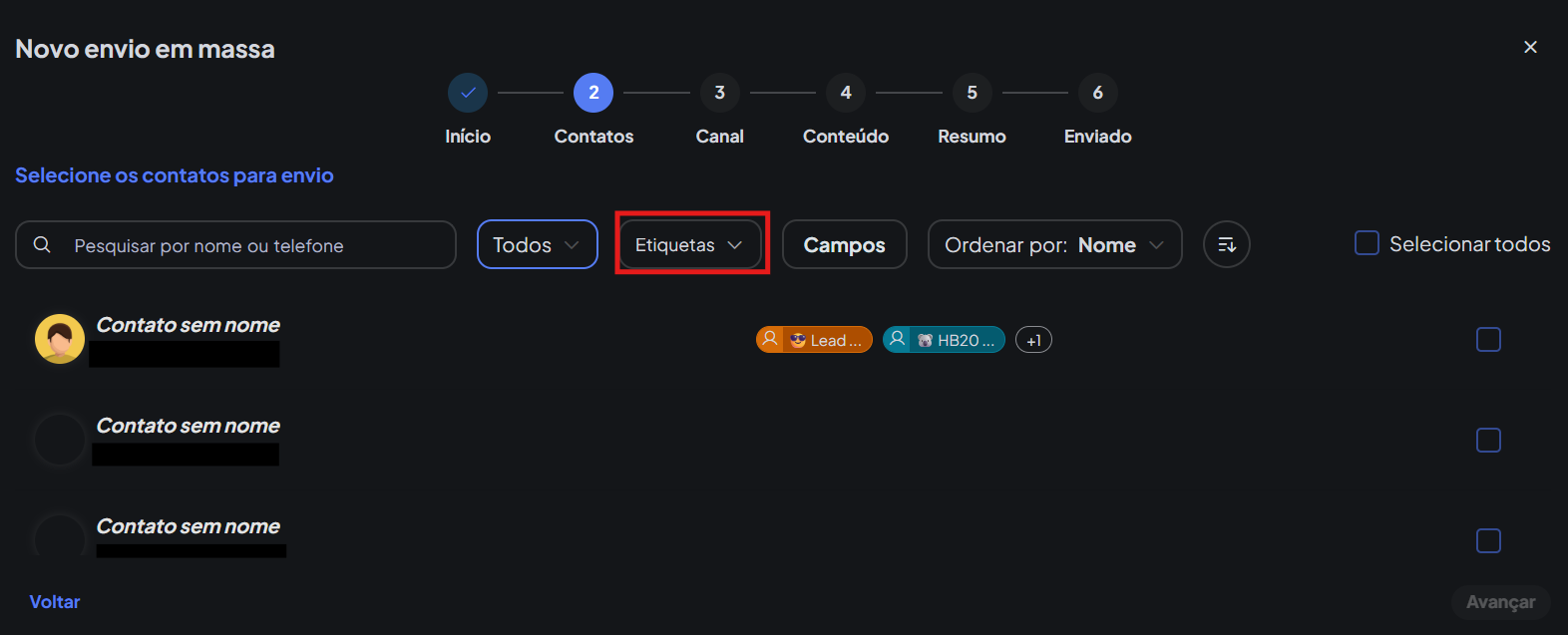 É possível também filtrar contatos a partir de etiquetas, facilitando a seleção