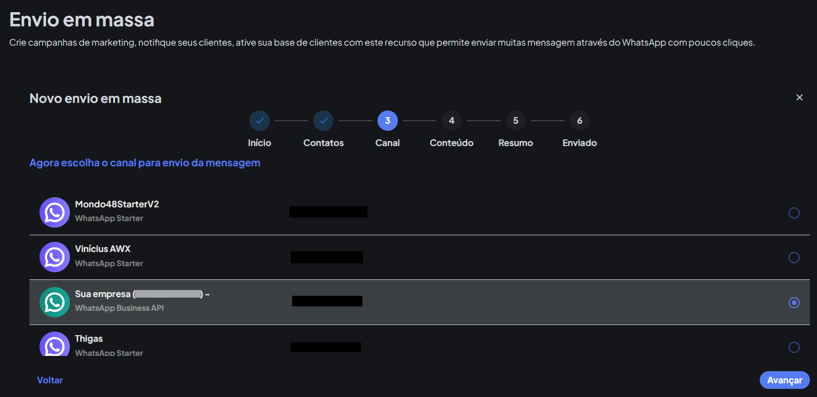 Agora é necessário selecionar o canal Empresarial que realizará o envio dessas mensagens, após realizar a escolha, clique em Avançar.