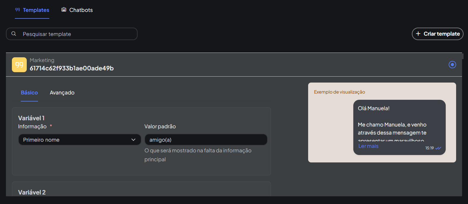 Caso seu template tenha variáveis, é necessário definir as informações dessas variáveis: