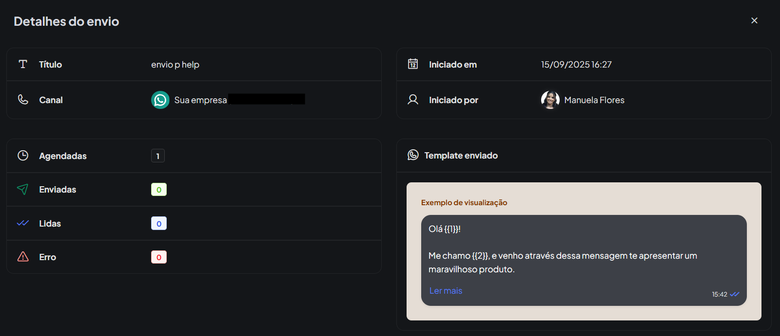 Aqui é possível ver um resumo dos dados desse envio, como data de envio, canal e o título definido.