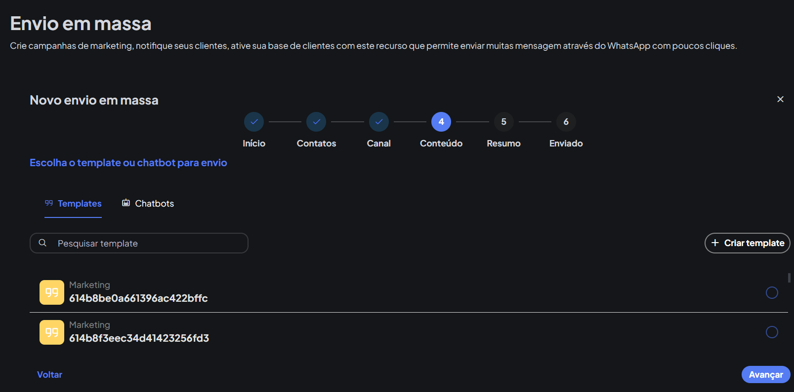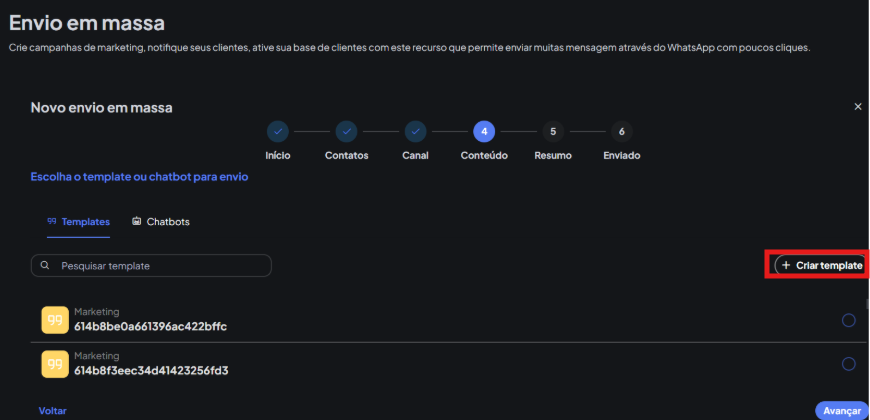 Você pode também, criar um novo template para utilização no envio em massa, clicando em + Criar template: