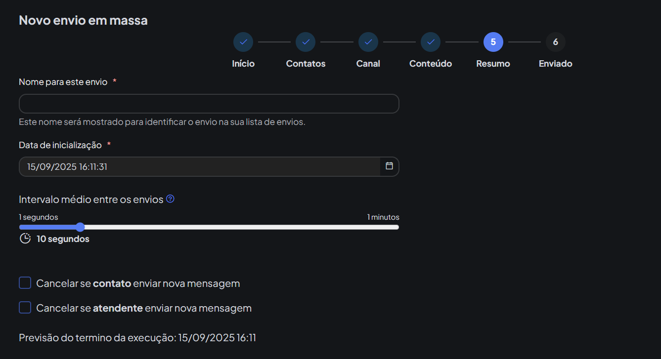 Em resumo você verá alguns detalhes sobre seu envio e poderá realizar algumas alterações que desejar, como qual será o intervalo médio entre os envios e se o envio deve ser cancelado caso o contato envie uma nova mensagem.