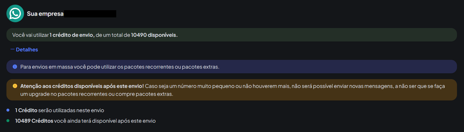 Além disso, será detalhado quantos créditos serão utilizados para envio da mensagem: