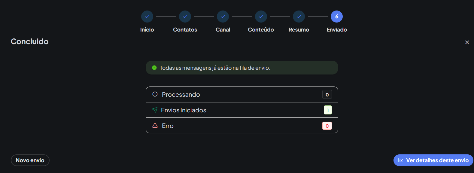Quando o envio for concluído ele dará detalhes das mensagens que estão em processamento, que foram enviadas e as que retornaram erro.