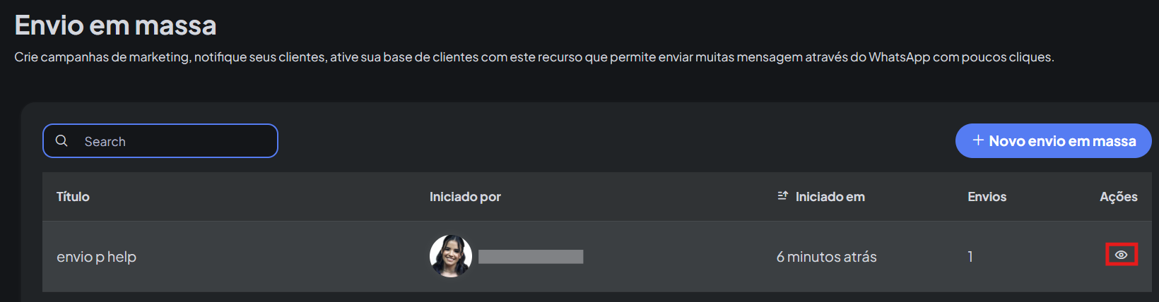 Clicando sobre o ícone de olho na coluna de Ação é possível visualizar os detalhes do envio: