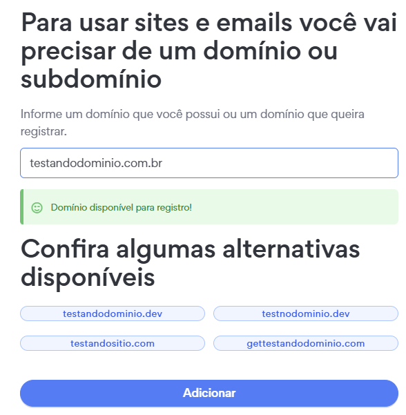 Digite o domínio que deseja registrar, será verificado a disponibilidade desse domínio. Se estiver disponível, é só clicar em Adicionar.