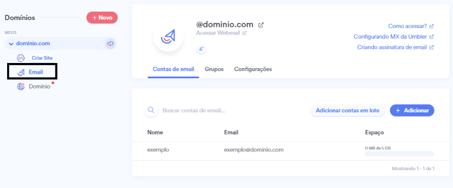 Para criar uma conta de e-mail no painel, você deve acessar a página de E-mails sob o domínio desejado no seu painel.