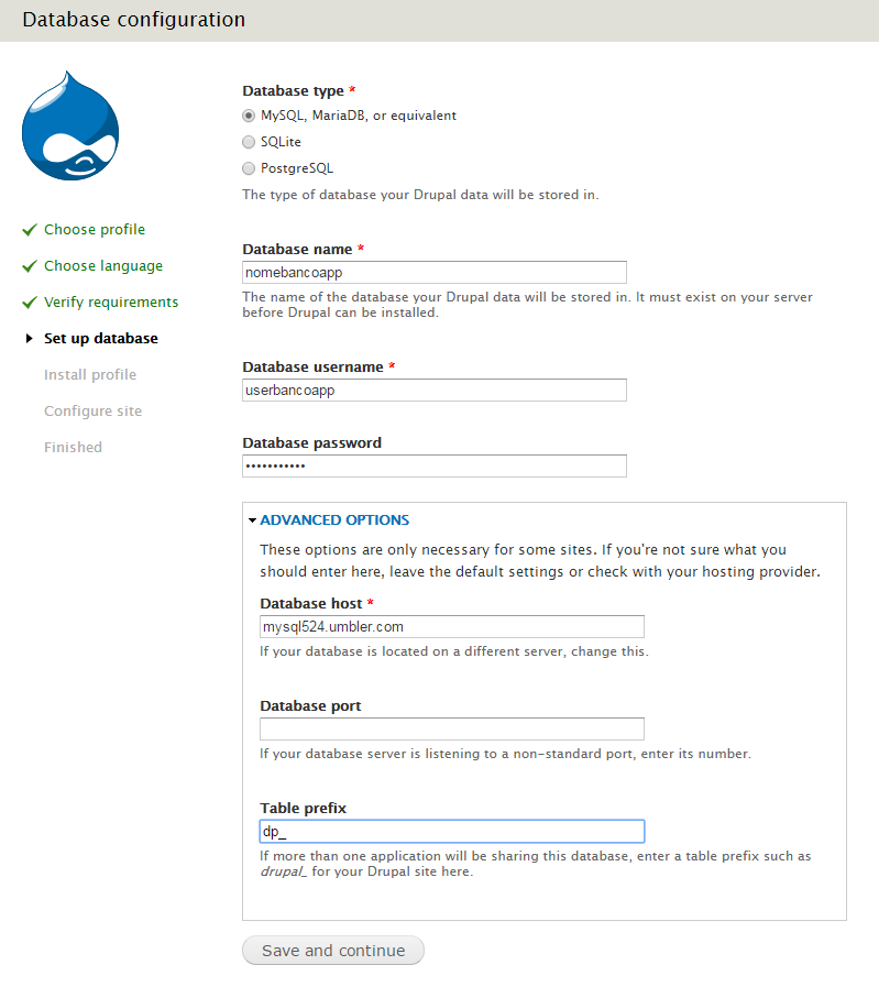 Table prefix: Informe o prefixo das tabelas ou mantenha o gerado.
