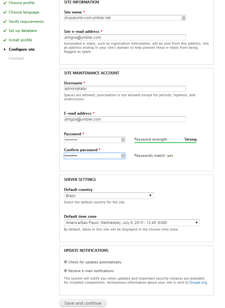 Selecione o país e fuso horário de seu site. Marque se deseja receber atualizações automáticas e notificações da drupal.org