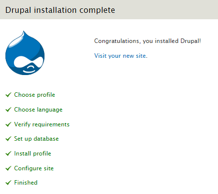 Pronto, sua instalação foi finalizada, você pode clicar em Visit your new site para visualizar seu site.
