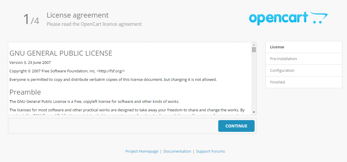 Clique em Continue para aceitar os termos de licença do OpenCart e iniciar a instalação.