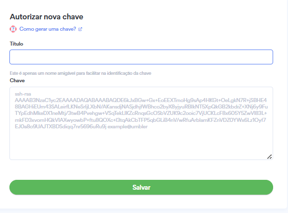 Após, insira o título da sua chave SSH para uma melhor identificação e insira a chave gerada de acordo com este guia.
