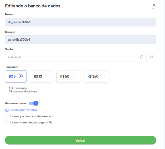 Recomendamos que utilize a opção Liberar somente para alguns IPs ou Liberado por 24h! afim de manter a segurança de seu banco.
