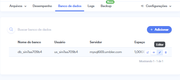 Acesse nosso painel de controle, clique sobre a opção Site, Banco de dados e passe o mouse por cima do banco de dados desejado, após, clique em "Editar":