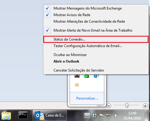 Na área de notificação(ao lado do relógio do Windows) segure Ctrl e clique com o botão direito do mouse em cima do ícone do Outlook, depois acesse o menu status da Conexão.