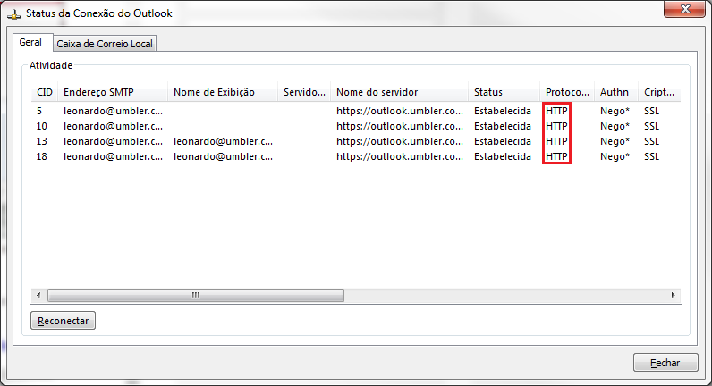 No dia 04/04/2016 foi habilitado o protocolo MAPI/HTTP no Exchange 2013 da nossa provedora, com isso, as contas configuradas deixam de utilizar o protocolo MAPI/RPC, legado de antigas versões do Exchange. Após esta alteração, a sincronização de dados passam a utilizar somente o protocolo HTTP(s).