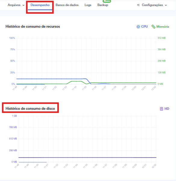 Após, acesse a aba "Desempenho" para verificar o histórico de consumo de disco: