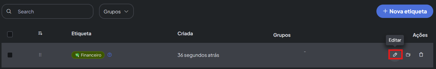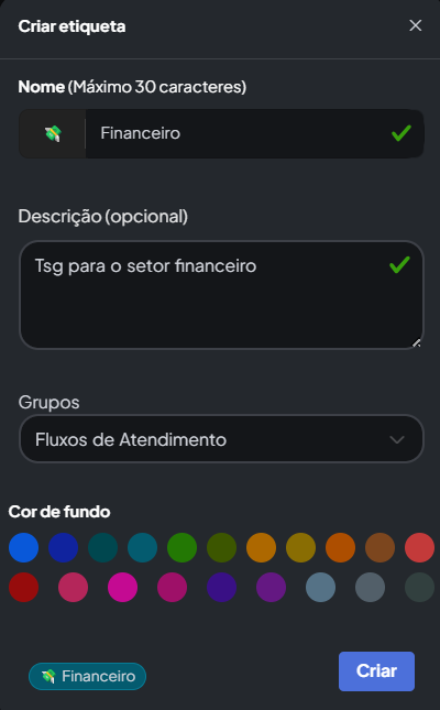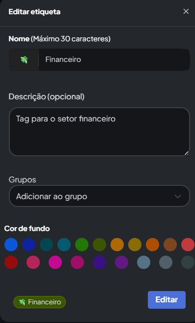 E por fim poderá selecionar um ícone para a etiqueta, cor, bem como deverá selecionar o nome da mesma, uma descrição opcional e clicar em Criar. No exemplo a seguir selecionei um ícone para a etiqueta, coloquei um nome de "Financeiro", digitei uma simples descrição e adicionei a tag a um grupo.