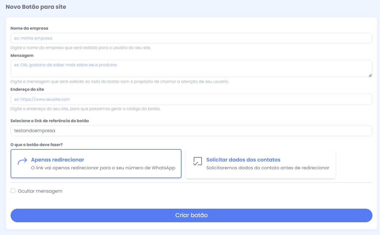 - Selecionar se o botão irá somente redirecionar o contato para o seu Whatsapp ou se irá solicitar dados do contato antes de redirecionar. - Pronto, seu botão foi gerado!