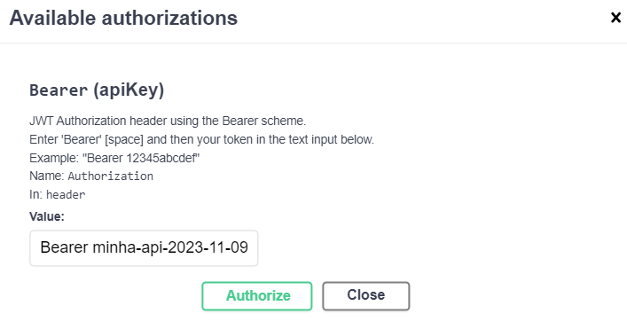 Authorization: Bearer minha-api-2023-11-09-2091-11-27--BB31288391DB49F4466D62C7FA681D854464608B73347C803AC0E959104C14B2