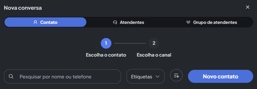 2 - Pesquise pelo nome do contato e clique sobre o nome do mesmo ao aparecer na busca. Após, será necessário selecionar o canal por onde a conversa será iniciada:
