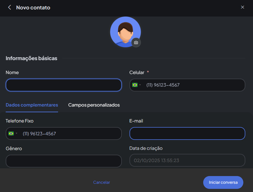 3 - Nessa parte basta digitar o nome do seu contato, telefone no formato DDD+ Nº de telefone, demais dados opcionais e clique em Iniciar conversa.