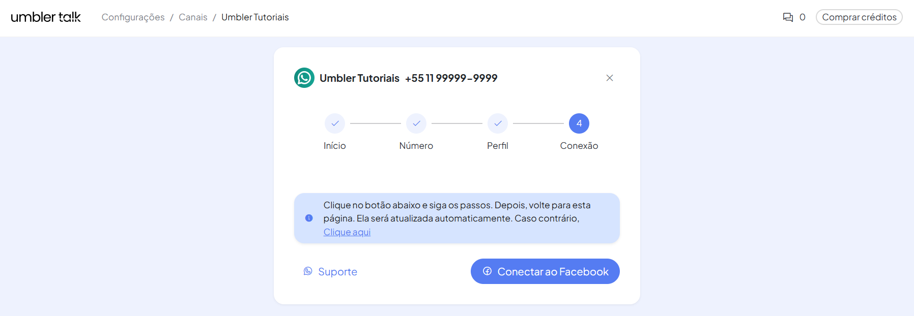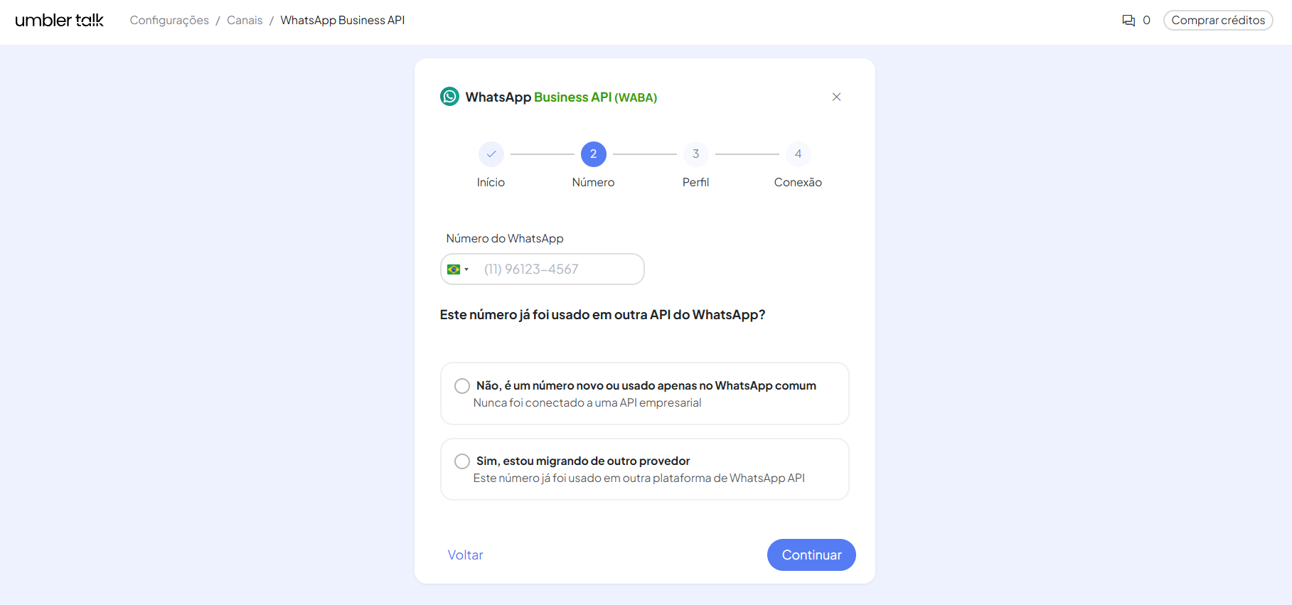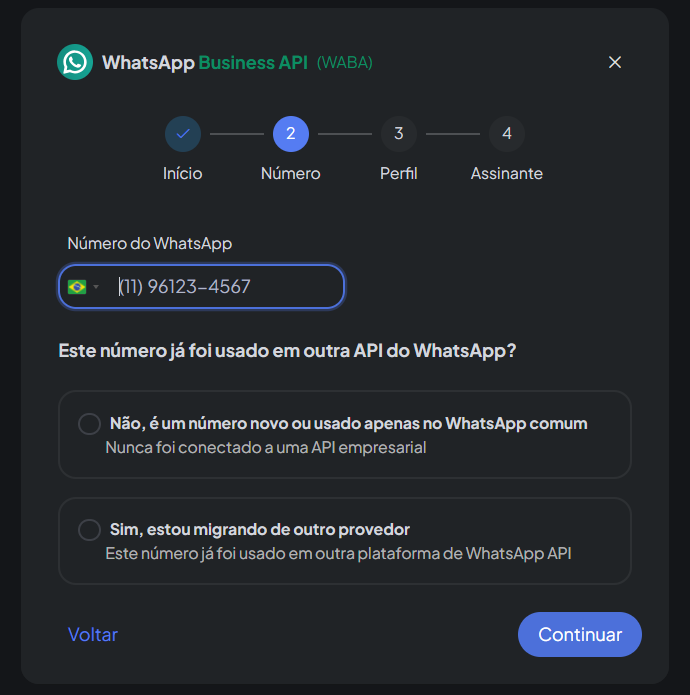Insira o número do telefone e selecione se é um canal Criado (Novo) ou Migrado (Caso esse número já seja um canal WhatsApp Business API). Após preencher, clique em Continuar.