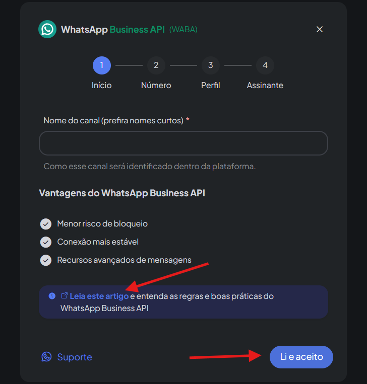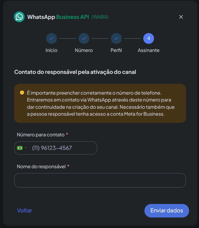 É importante salientar que, em condições normais, a ativação do canal no WhatsApp pode levar cerca de 4 dias, podendo ocorrer um pouco antes ou depois, dependendo de variáveis como dificuldades encontradas pelo cliente e tempo de conclusão, entre outros. Além disso, ao concluir a Etapa 2 no Facebook e assinar o contrato, o canal é geralmente ativado automaticamente em poucos minutos, desde que não haja nenhum erro durante o processo.
