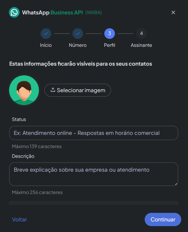 Nessa etapa você irá configurar as informações do perfil que serão exibidas aos seus contatos. Insira o status e a descrição do canal.