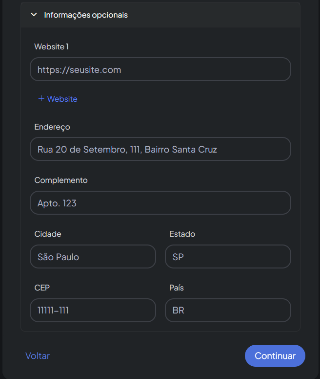 Caso seja de sua preferência, clique em Informações Opcionais e preencha os campos disponíveis