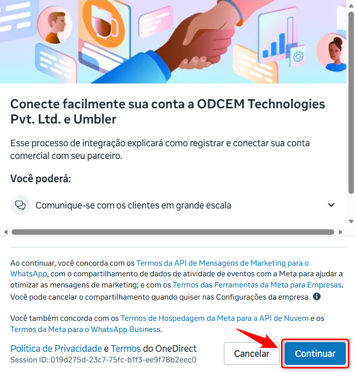 Clique em Continuar para avançar para a próxima etapa da integração.