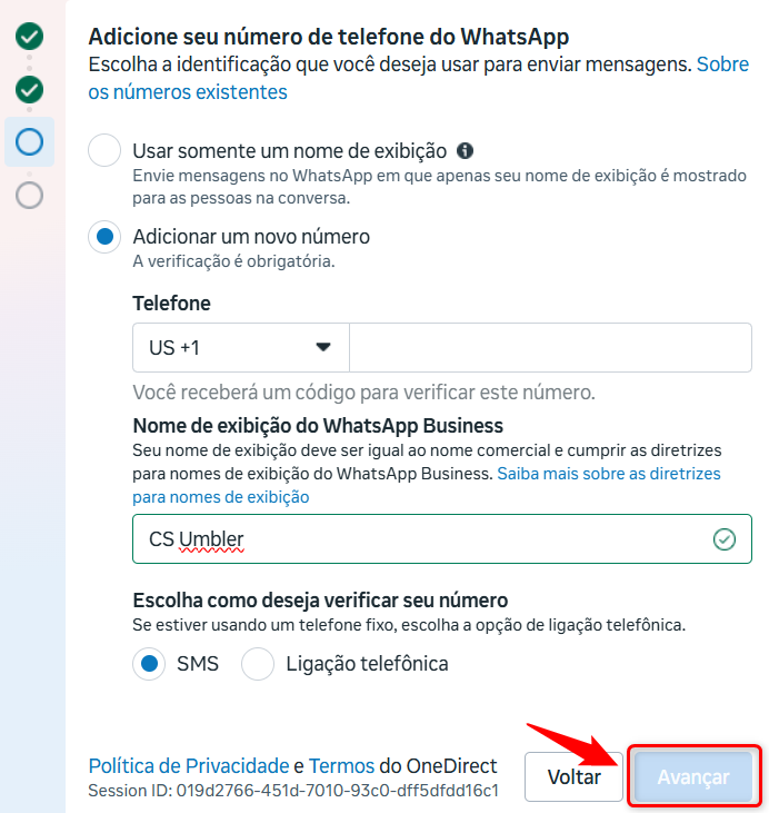 Selecione a opção 'Adicionar um novo número', informe o número de telefone, defina o nome de exibição e escolha o método de verificação. Em seguida, clique em Avançar.