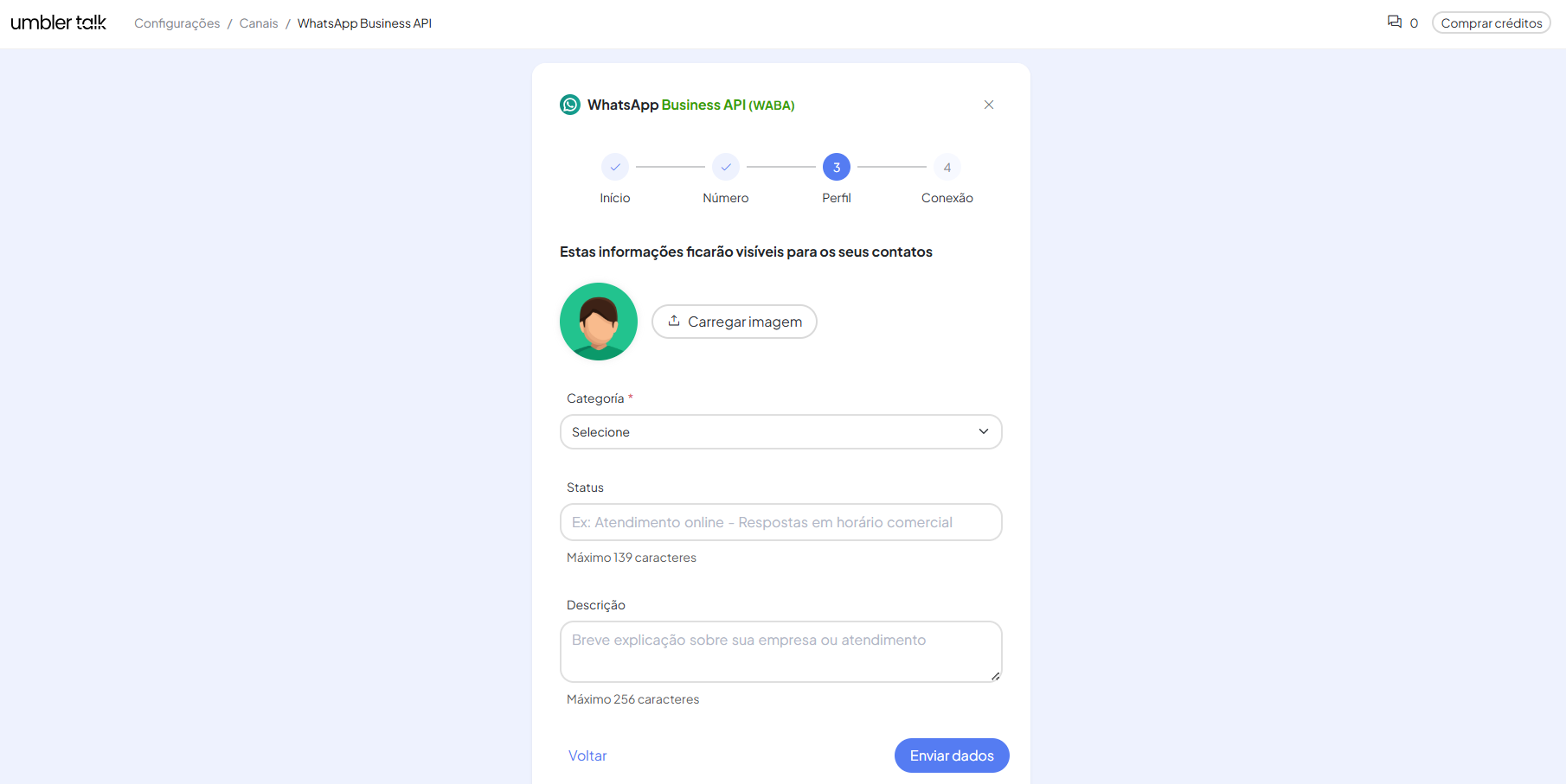 Nessa etapa você irá configurar as informações do perfil que serão exibidas aos seus contatos. Insira o status e a descrição do canal. Caso seja de sua preferência, clique em Informações Opcionais e preencha os campos disponíveis.