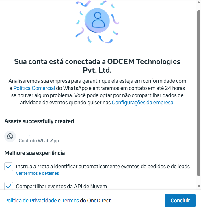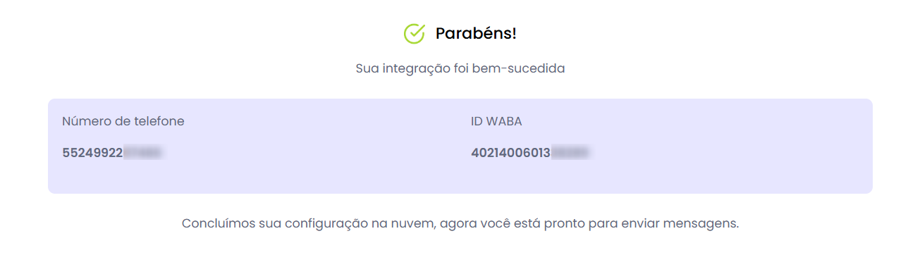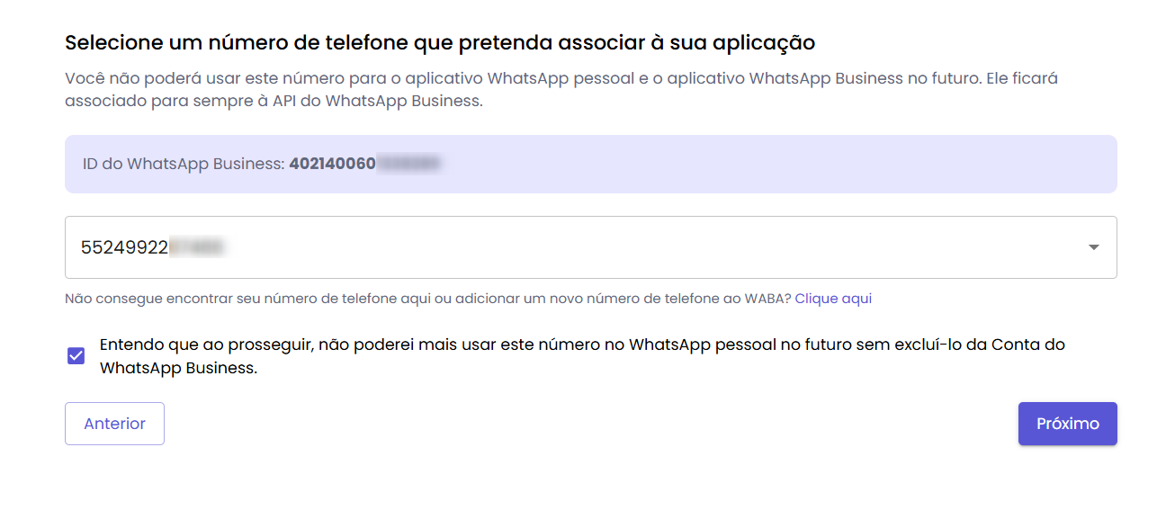 Volte a tela inicial, selecione o número que deseja associar e clique em Próximo:Se nenhum erro ocorrer e o processo for executado corretamente, você receberá uma mensagem confirmando a criação da sua conta.
