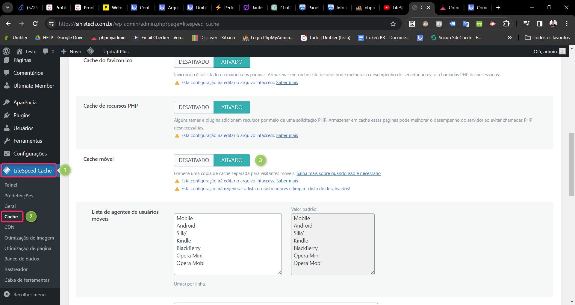 Na aba Cache as opções recomendadas já vem ativadas, sendo assim, aqui podemos apenas ativar a opção do Cache móvel: