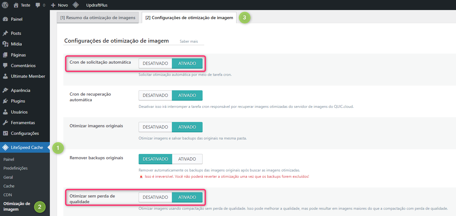 Em Configurações de otimização de imagem ative a opção Cron de solicitação automática e Otimizar sem perda de qualidade: