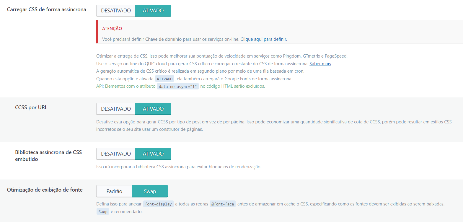 Ainda em Configurações de CSS ative também Carregar de forma assíncrona, CCSS por URL e em Otimização de exibição de fonte selecione Swap. Ao fim, salve as configurações para não perdê-las.