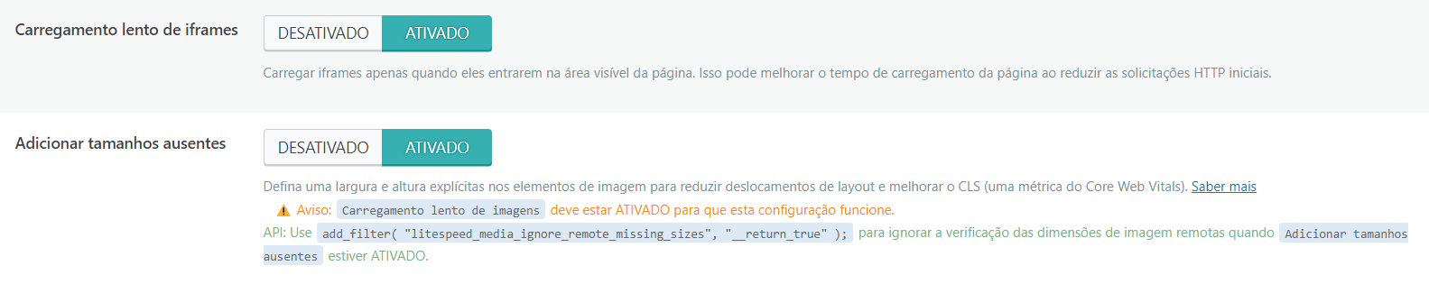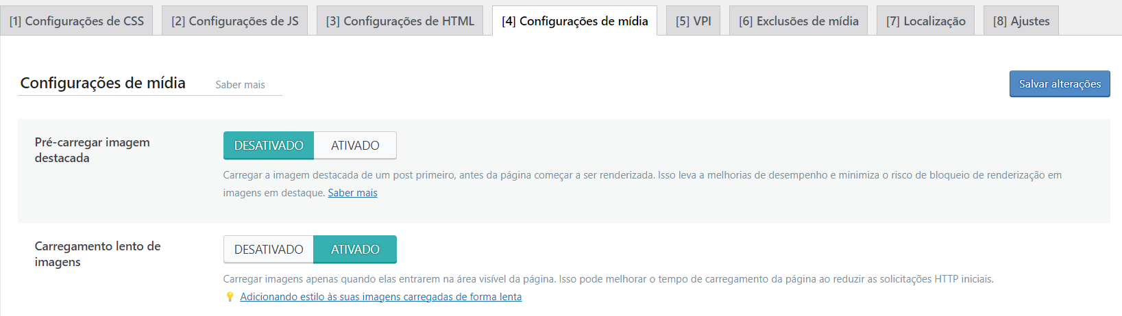 Em Configurações de mídia ative a opção Carregamento lento de imagens, Carregamento lento de iframes e Adicionar tamanhos ausentes.