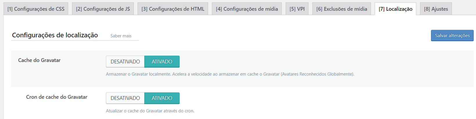 Em Localização ative as opções Cache do Gravatar e Cron de cache do Gravatar: