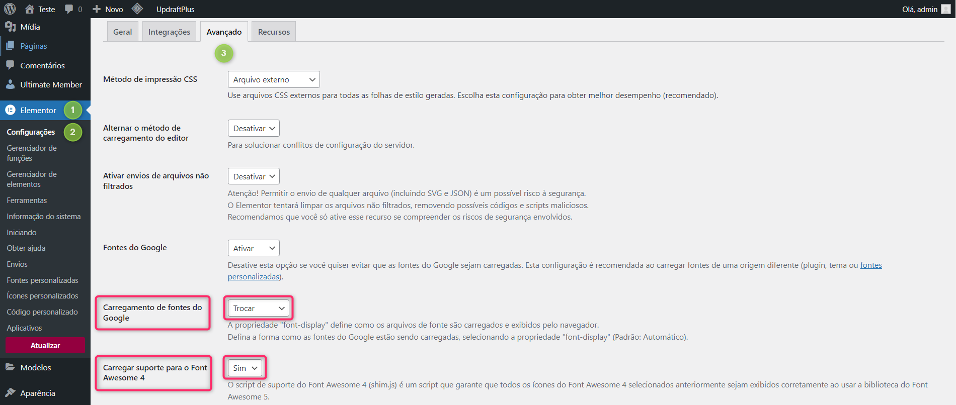 Em Elementor ➝ Configurações ➝ Avançado, selecione as seguintes opções: