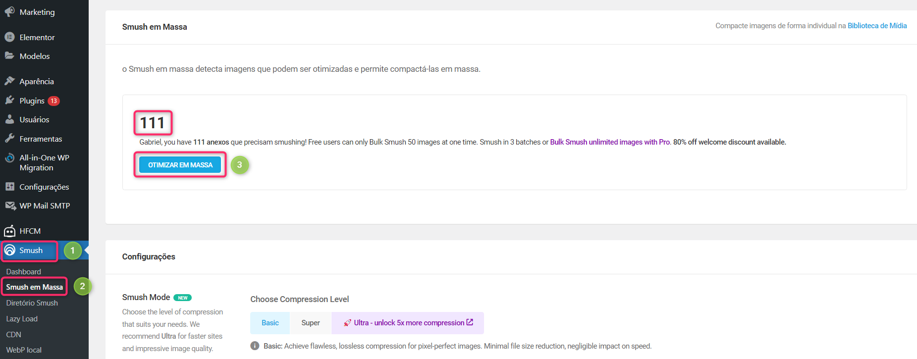 No canto esquerdo clique em Smush -> Smush em Massa. No exemplo da imagem a seguir o plugin sugeriu otimizar 111 imagens, sendo assim, para otimizar basta clicar em Otimizar em Massa.