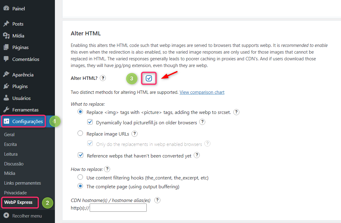 Em Configurações ➝ WebP Express, ative a opção Alter HTML: