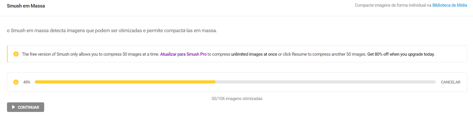 A versão gratuita do plugin permite a otimizaçao de 50 cada imagem por vez. Caso tenha um número que isso, clique em Continuar até que todas as imagens sejam otimizadas. -