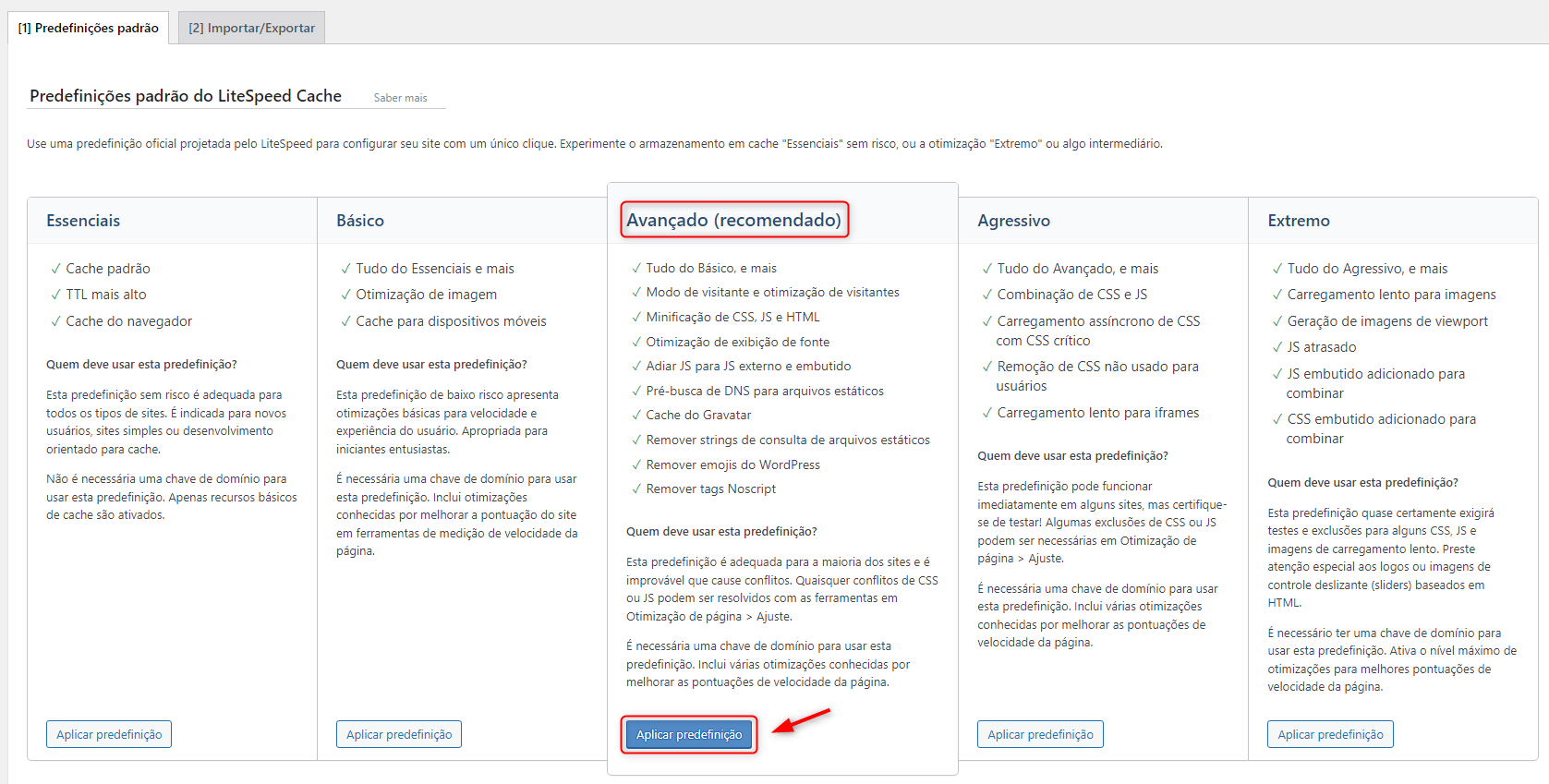 Após instalar o plugin LiteSpeed Cache, é possível alcançar resultados satisfatórios ao acessar seu menu, selecionar a opção 'Predefinições' e aplicar a configuração padrão disponível. No entanto, se desejar aprimorar ainda mais, considere experimentar as seguintes configurações recomendadas. Elas estão organizadas em passos distintos para otimizar o desempenho do seu site.